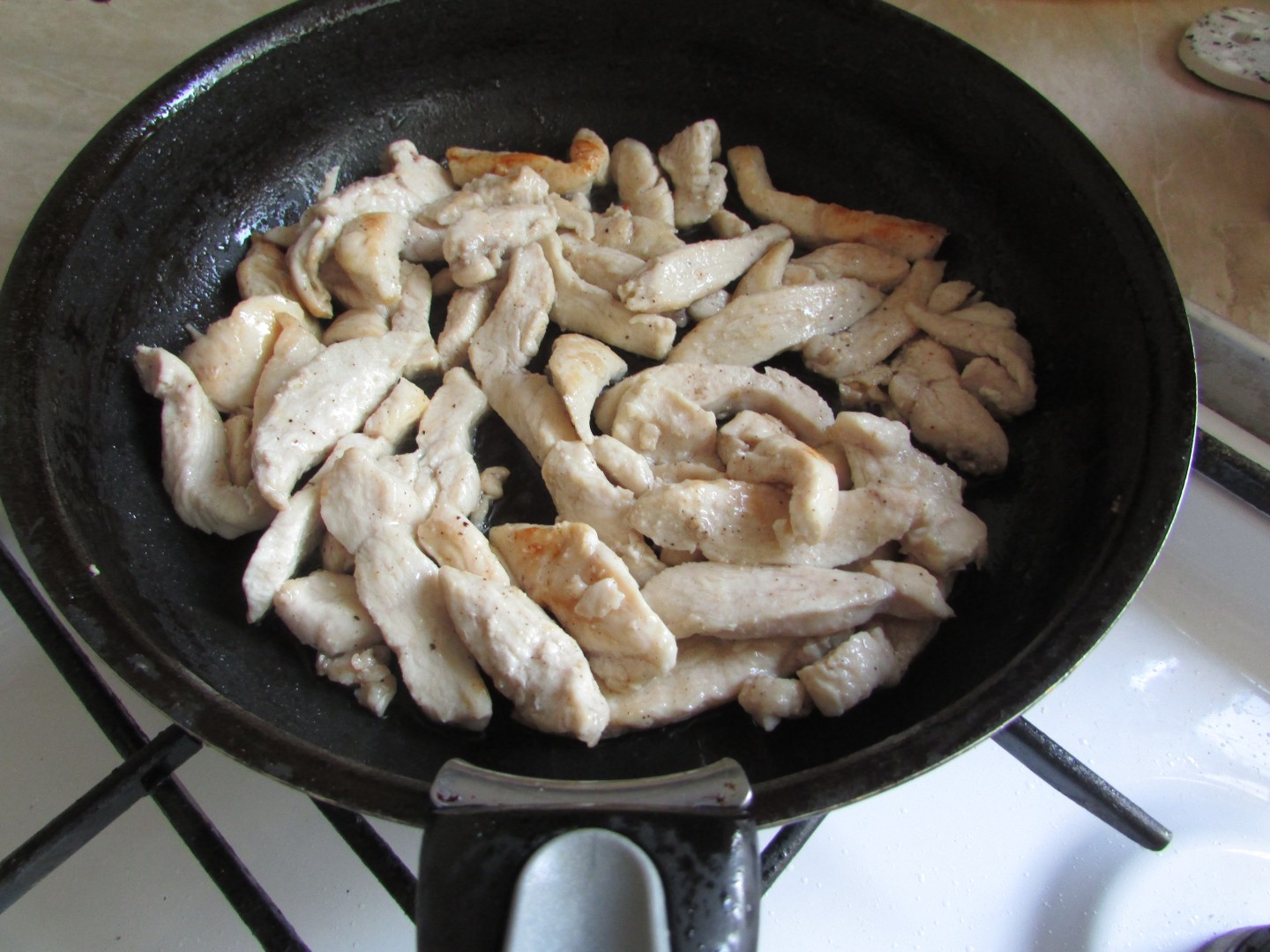 Я филе обжарила. Для этого мясо помойте, хорошо обсушите. Нарежьте тонкими, длинными полосками вдоль волокон. Раскалите 3 ст.л. растительное масло на сковороде с толстым дном, обжарьте мясо 3-4 минуты на сильном огне. Немного посолите и поперчите. Не пересушите, до лёгкой золотистости достаточно, курица готовится быстро. Обжаренное филе переложите на бумажное полотенце, чтобы сбежало лишнее масло.