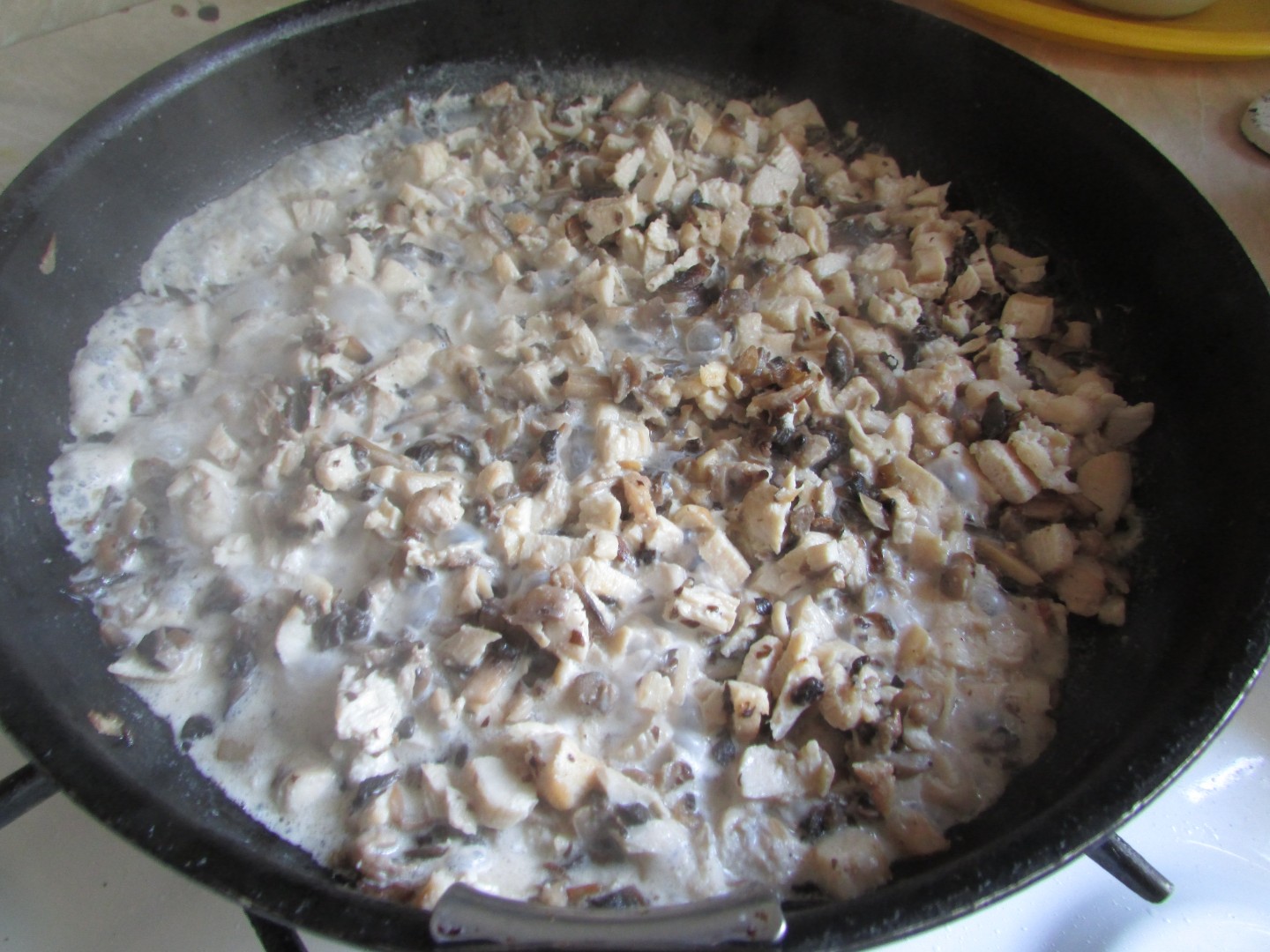 На чистой сковороде раскалите 2 ст.л. растительное масло, закиньте шампиньоны. Обжаривайте до выпаривания жидкости, когда начнут золотиться, добавьте филе. Перемешайте и влейте немного сливок, посолите по вкусу. Обжаривайте до полного выпаривания сливок, но масса должна оставаться влажной, снимите с огня. Не пересушите, чтобы начинка была сочной. Дайте массе остыть.