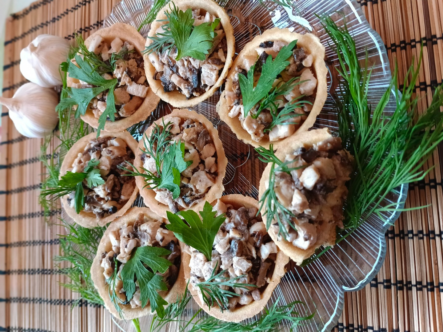 Решила приготовить тарталетки с курицей грибами и сыром в духовке. Для первого раза я решила использовать тарталетки салатные среднего размера из магазина, поэтому духовку не пришлось использовать, а приготовление блюда заняло всего около 25 минут. В коробке тарталеток было 15 штук, и исходя из количества ингредиентов на 12 порций мне хватило приготовленной начинки на все 15 штук. Я делала всё по рецепту, пошагово, рецепт подробный, справится любая хозяйка. Для украшения готового блюда я использовала по вкусу только зелень (укроп и петрушку). Тарталетки получились невероятно вкусные, сырно-чесночная подушечка отлично сочетается с куриной-грибной начинкой, а зелень добавляет нотку свежести во вкус. Внешне такое блюдо выглядит очень аппетитно, получается довольно сытным и прекрасно смотрится на праздничном столе. Спасибо большое автору за рецепт, буду пробовать разнообразие начинок, а также приготовление тарталеток своими силами из слоеного теста.