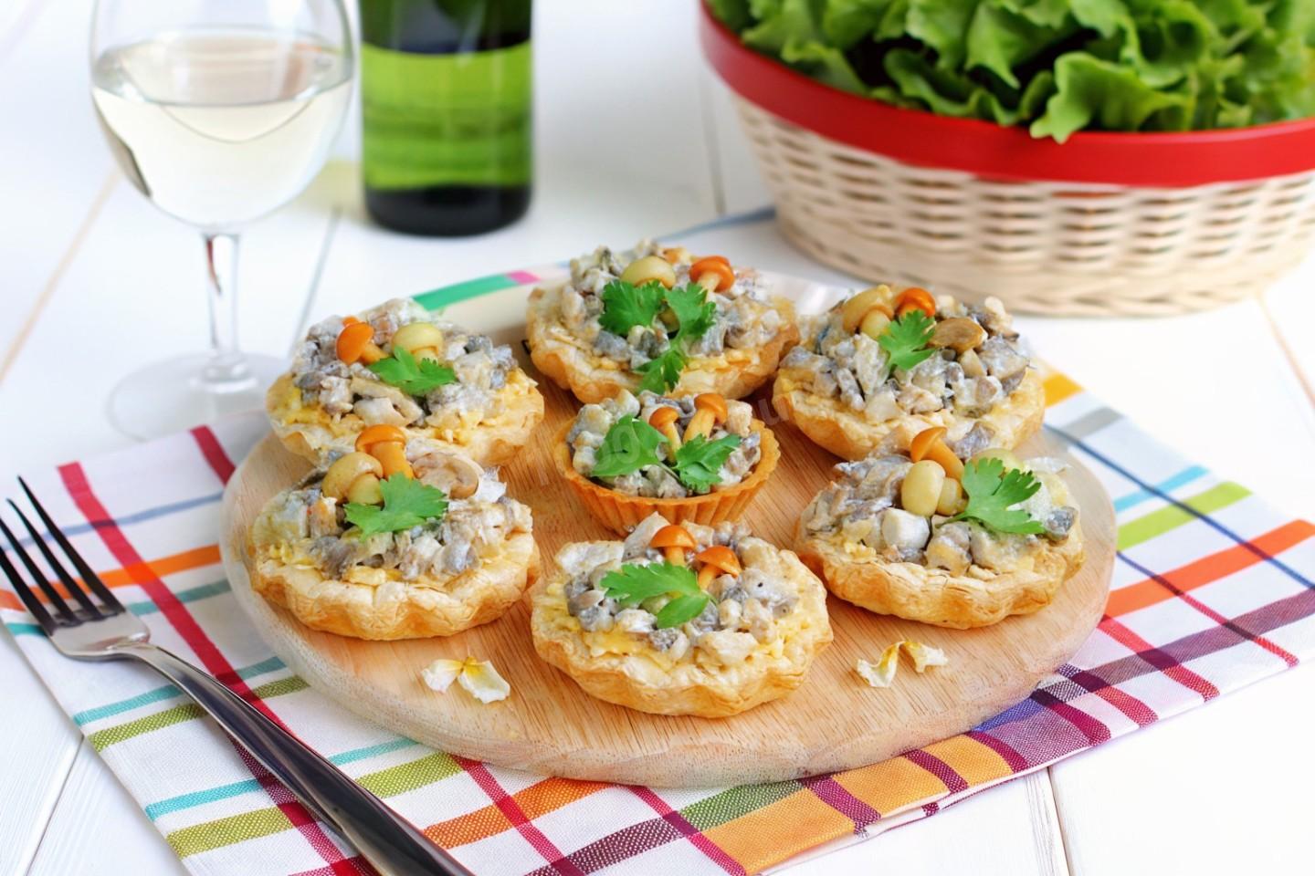 Для такой закуски хозяйки чаще берут готовые тарталетки. Лучше всего использовать салатные, среднего размера.