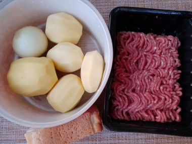Как запечь тефтели с картошкой в духовке? Подготовьте необходимые продукты. Фарш может быть любой, у меня - смешанный, говядина и свинина. Белый хлеб можно взять посохший.
