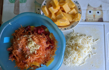 Сыр натереть на терке, разделить на 3 части, 2/3 смешиваем с овощами, а 1/3 используем для получения сырной корочки.
