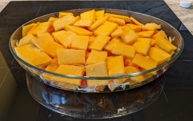 Тыкву очистить и порезать на небольшие ломтики, 1/4 часть отложить на верхний слой.