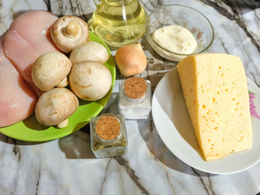 Как сделать куриную грудку с грибами и сыром в духовке? Подготовьте для этого необходимые ингредиенты. В качестве куриного филе подойдет куриная грудка. Шампиньоны можно заменить на вешенки или лесные грибы. Сыр берите любой на сове усмотрение, главное, чтобы он легко терся на терке и хорошо плавился.