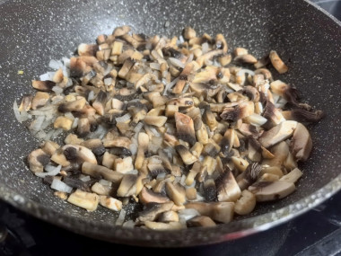 Лук чуть обжарила , добавила грибы . Жарила , пока не ушла вся влага .