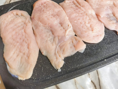 Филе куриных грудок прорежьте вдоль. Выложите получившиеся кусочки на доску и немного отбейте с помощью кухонного молоточка.