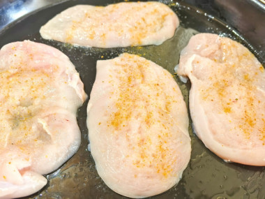 Для запекания подойдет любая жаропрочная форма. Я буду готовить в керамической. Смажьте форму растительным маслом и выложите отбитое куриное филе. Посыпьте солью и специями.
