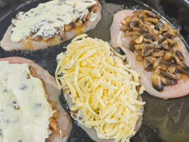 Грудку отбила , выложила на противень. Соль и приправы добавила , выложила грибы с луком, смазала майонезом , и сверху сыр натерла. 30 минут в духовке , ужин готов 🍽️