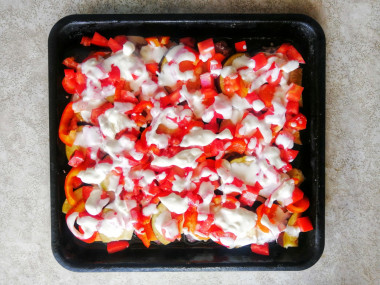 В смазанную растительным маслом форму для запекания выложите мясо. Смажьте его частью сметаны.