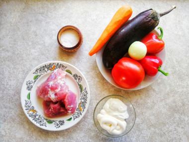 Как запечь мясо с овощами в духовке? Очень просто! Для начала подготовьте необходимые ингредиенты по списку. Свинина нужна без костей и не очень жирная, впрочем выбирать мясо можете по своему вкусу. Какое мясо можно брать помимо свинины? Любое. Подойдет говядина, баранина, курица или индейка. Но при этом учитывайте, что изменится калорийность и время приготовления блюда.