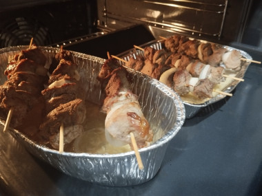 Отправьте противень с шашлыками в духовой шкаф и запекайте блюдо до образования румяной корочки (примерно 30-40 минут). Важно периодически поворачивать шпажки, чтобы мясо подрумянилось со всех сторон. Как проверить готовность шашлыка? Разрежьте кусочек мяса, если внутри оно не красное и вытекает прозрачный сок, значит блюдо готово.