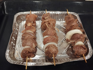 Шпажки положила ненадолго в воду, затем нанизала мясо на шпажки поочередно с кольцами лука.
