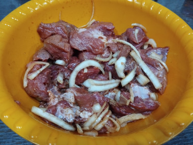 Мясо порезала средними кусочками и замариновала в луке,как советует автор. Убрала в холодильник мариноваться примерно на 2 часа. Взяла ещё одну небольшую луковицу и порезала кольцами.