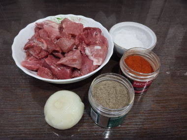 Свинину помойте, обсушите бумажными полотенцами. Нарежьте поперек волокон кусочками среднего размера (около 4 см шириной). Переложите их в глубокую миску. Репчатый лук очистите от шелухи, нарежьте четвертинками и еще пополам. Часть лука нарежьте мелко. Выложите весь лук к мясу, посолите, поперчите и перемните все руками, чтобы выделился луковый сок. Закройте крышкой или затяните миску пищевой пленкой и поставьте на 2 часа в холодильник для маринования.