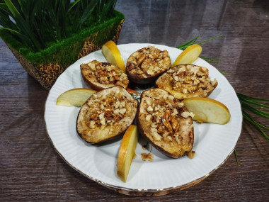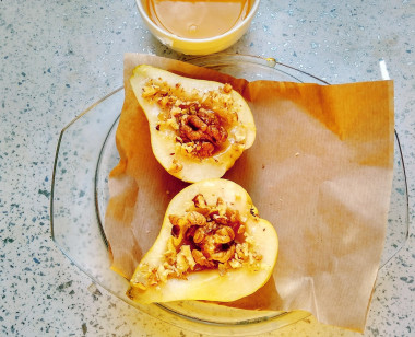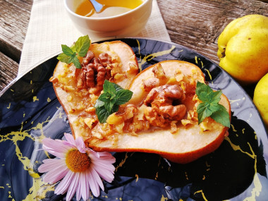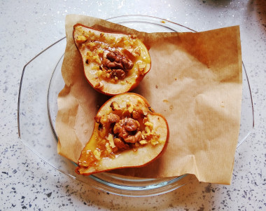 Нашла еще один рецепт горячего фруктового десерта, в последнее время мне полюбились такие вот вкусняшки. На этот раз груша. Груши у меня свои с дерева, поздний сорт, как раз они доспели к этому времени. Мякоть вырезала обычной чайной ложкой, это оказалось легко сделать. Мед взяла цветочный, сначала немного налила в выемку, потом заполнила половинками грецкого ореха, затем еще мед сверху по всей поверхности, и снова ореха. Корицу не использовала. Я бы, наверное, и сырым все это съела, но надо же попробовать конечный результат! Когда прочитала, что запекать грушу надо примерно пол часа, даже удивилась, казалось, что это слишком долго. Но моя груша запекалась 25 минут, не меньше. Я наблюдала как меняется цвет кожуры от среза и ниже. Как весь цвет поменялся, вынула десерт из духовки. Мне понравилось и горячим и чуть остывшим. В горячем виде лучше чувствуется сладость меда. В сочетании с орехами просто замечательно. Груша дала много сока, который смешался с медом, получился вкусный душистый сироп. Десерт мне по душе, дети отказались пробовать) Спасибо за новый опыт!