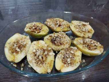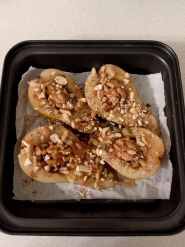 Груши порезала пополам, ножом вырезала серединки, в которые положила половинки орехов. Слегка посыпала корицей, полила медом и посыпала измельчёнными орешками. Запекала в духовом шкафу 25 минут при 180°.