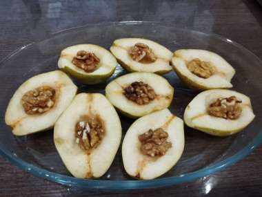 В серединку каждой половинки груши выложите по 2 сложенные вместе половинки грецких орехов. Грецкие орехи можете заменить любыми другими орехами по вкусу. Хорошо подойдет пекан, фундук, кедровые.