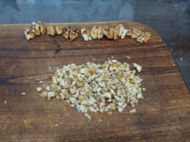 Если у вас есть целые половинки грецких орехов, отложите 8 штук, а остальные порубите ножом. Грецкие орехи можете заменить другими орехами по вкусу. Отлично подойдут пекан, фундук, кедровые орешки.