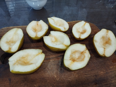Груши вымойте, обсушите и разрежьте пополам. Аккуратно нуазеткой выньте семена и немного мякоти, стараясь не повредить стенки. Если нет нуазетки, можете заменить ее чайной ложкой или воспользоваться ножом. Сбрызните груши лимонным соком, чтобы не потемнели.
