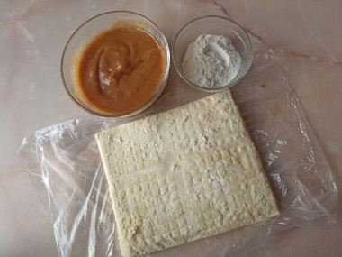 Как сделать слоеные пирожки с вареньем в духовке? подготовьте для этого необходимые ингредиенты. Слоеное тесто можно использовать и дрожжевое и бездрожжевое. Ориентируйтесь на свой вкус. У меня бездрожжевое тесто. Обычно оно продается в замороженном виде, поэтому заранее достаньте его из морозильной камеры и оставьте при комнатной температуре, чтобы оно разморозилось. Варенье для пирожков берите достаточно густое, чтобы оно не растекалось при выпечке.
