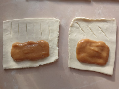 Стол немного присыпьте мукой. Размороженное слоеное тесто немного раскатайте с помощью скалки и разрежьте на 4 прямоугольника. На половине каждого прямоугольника сделайте 3-4 надреза. Это необходимо для того, чтобы горячий воздух при выпечке выходил из слоек. Иначе они могут лопнуть и варенье вытечет.