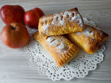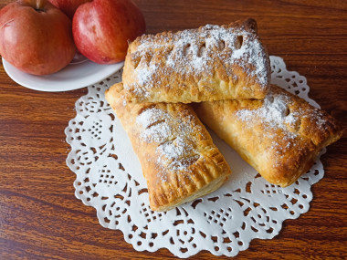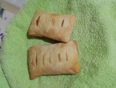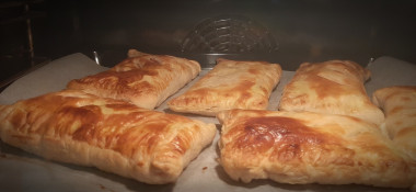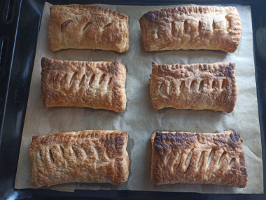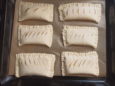 Противень для выпечки застелите кулинарным пергаментом и выложите на него подготовленные слоеные пирожки. Для румяной корочки поверхность слоек можно смазать яичным желтком или молоком. А можно немного подержать под грилем в конце выпекания.