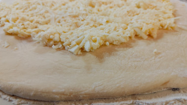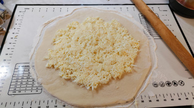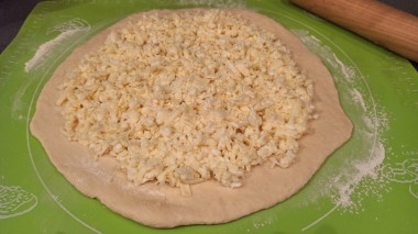 В центр выложите сырную начинку и пальцами распределите ее по тесту, не доходя до краев 3 см.