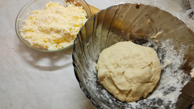 Муки на тесто у меня ушло больше, чем по рецепту, примерно 420 грамм вместо 350, потому что тесто продолжало быть слишком липким к рукам. Так что следовала рекомендации по необходимой консистенции.