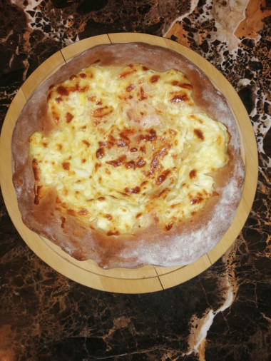 Не получилось раскатать до 35см, завернуть и переложить. Там 350гр муки и 400гр начинки в виде сыра! При любой попытке перевернуть, переложить - тесто рвётся, сыр вылезает. Лучше уже делать по-человечески: разделить тесто на 2 части, одну раскатать и на неё нанести начинку, потом раскатать второй кусок и им накрыть первый, края закрепить, чтобы на выходе поучилась лепешка, а не лодочка по Аджарски.