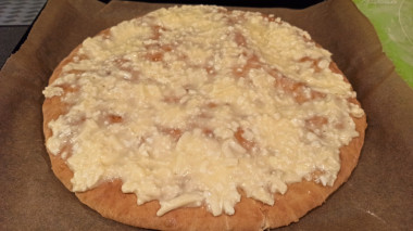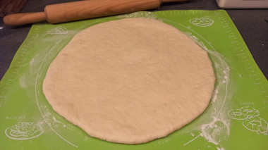 Тесто раскатайте на присыпанном мукой столе в круглый пласт толщиной 1 см и диаметром около 35 см.