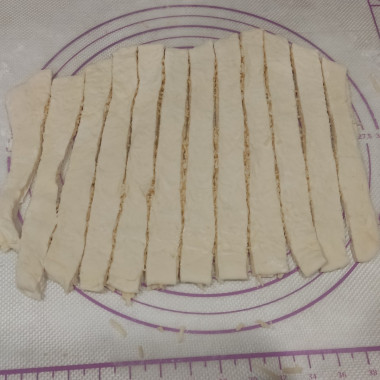Разрезаем тесто на длинные полоски толщиной 1-1,5 см