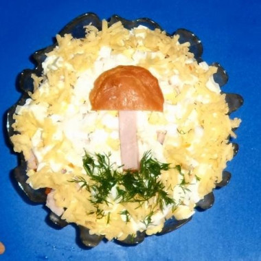 Лесные грибочки с нежной ветчиной в кружевном вальсе. Салат Ирина с копчёной курицей и грибами очень вкусный и сытный! Салатик выкладывается на тарелку слоями, поэтому и смотрится очень красиво. А чтобы было ещё красивее, мне помогали дочурка и сыночек его украсить. Вот что у малышни получилось
