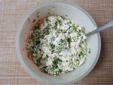 Творог у меня был зерненый и сухой, но я его просто размяла вилкой и когда добавила зелень и яйцо получилась масса нужной консистенции.