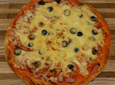 Очень вкусная, пышная домашняя мясная пицца!!! Я очень люблю пиццу. Перепробовала много рецептов и определила для себя, что пицца именно по этому рецепту - самая вкусная. Я не использую в пицце майонез и кетчуп. Вместо кетчупа смазываю основу домашним соусом...От себя ещё маслины добавила. Большое спасибо за рецепт!