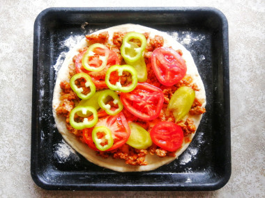 Приготовила сегодня домашнюю мясную пиццу на дрожжевом тесте. Замесила тесто, обжарила свиной фарш с луком и томатной пастой. Когда тесто подошло, выложила фарш, а сверху добавила помидор, соленый огурчик (добавила его от себя, очень нравится его аппетитная кислинка), болгарский перец и натертый сыр. Болгарский перец выложила только на одну сторону пиццы - для мужа. Ему нравится, когда я добавляю перец в какое-либо блюдо. Все овощи нарезала крупно. Шампиньоны, репчатый лук и чеснок я в начинку не добавляла.