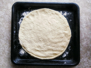 Выложите половину теста (так как из указанного количества ингредиентов выходит 2 пиццы) и растяните его руками по форме для выпекания пиццы (диаметр 30 см). Делать это нужно аккуратно, посыпая мукой и приминая ладонями, так как тесто у нас довольно тонкое.