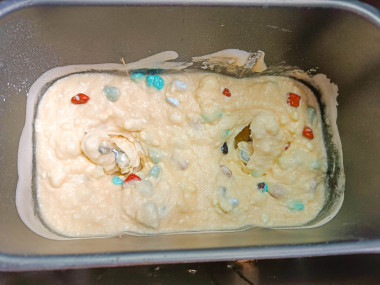 Поставьте режим "Кекс", у меня она 2 часа 50 минут. В зависимости от особенностей вашего прибора режим может называться по-другому. Сверьтесь с инструкцией к вашей хлебопечке. Где-то в середине программы моя хлебопечка подает сигнал о том, что можно добавлять изюм. Я его предварительно промыла и обваляла в муке. Следите за консистенцией теста, если оно получится слишком жидкое, то добавьте ещё немного муки.