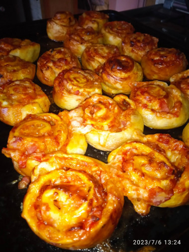Тесто раскатать, смазать кетчупом, посыпать мелко нарезанным беконом, посыпать сыром, свернуть в рулет. Слоеное тесло можно сделать самостоятельно. Под шагами вы найдете ссылку на каталог рецептов домашнего слоеного теста.