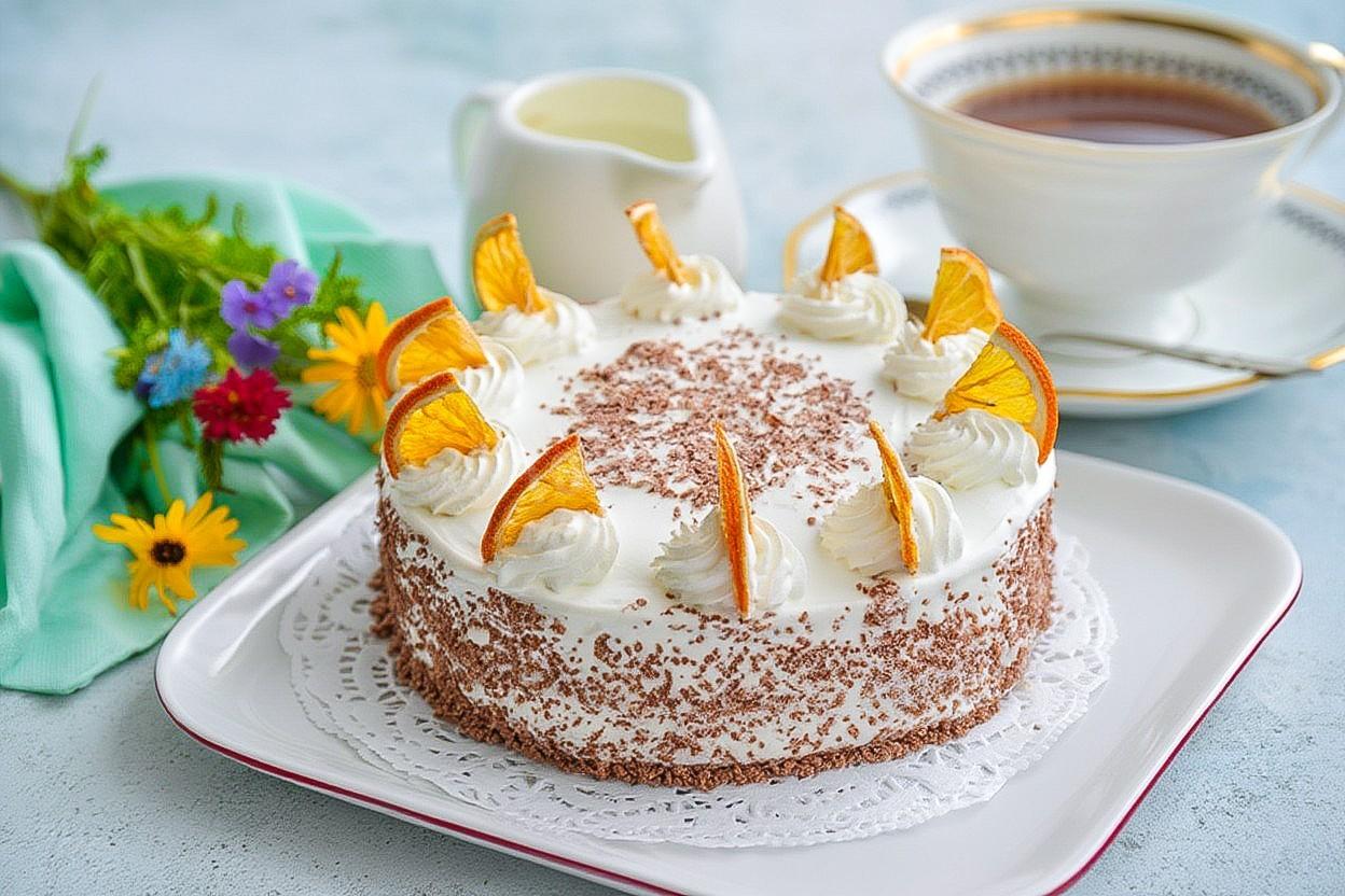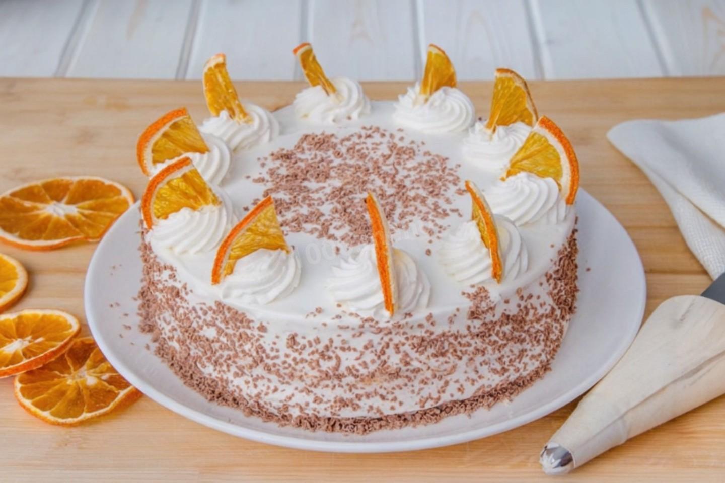 Апельсиновый торт готов. Дайте ему пропитаться в течение нескольких часов и можете подавать. Приятного аппетита!