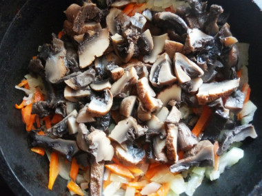 В зажарку добавьте отварные грибы. Обжаривайте все вместе еще 3-5 минут.