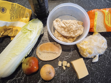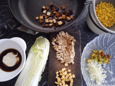 Понравился мне салат ревнивец с курицей, кукурузой, сухариками и сырными шариками. Решила приготовить такой салат на ужин. Куриное филе у меня было заранее приготовлено на пару с приправой для курицы. Кукурузу я взяла в зёрнах замороженную и отварила в подсоленной воде. Кусочки хлеба нарезала кубиками и обжарила на масле, получились хрустящие сухарики. Пекинскую капусту мелко покрошила. Перец болгарский нарезала кубиками. Лук мелко порезала и обдала кипятком. Для соуса смешала соевый соус и майонез. А вместо сырных шариков я порезала голландский сыр кубиками.