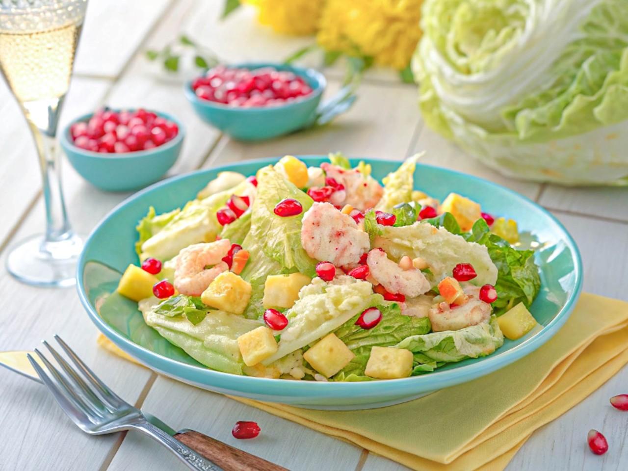 Шаг 1. Как сделать салат Стрелы Амура с креветками, гранатом, ананасом и пекинской капустой