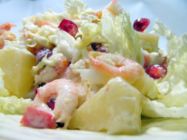 Такой вариант салат не пробовала, возьму на заметку. Готовлю салат с креветками, пекинской капустой и ананасами. Тоже неплохо.