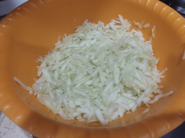 Кабачки хорошо помойте, отрежьте кончики. У меня кабачки средней зрелости. Я очистила их при помощи овощечистки, но семена не вырезала, так как они маленькие. Натрите кабачки на крупной терке в большую миску. Всыпьте в них соль и хорошо перемешайте кабачковую массу. Оставьте ее постоять на 10 минут. За это время соль вытянет из кабачков жидкость, которую надо будет слить, чтобы запеканка не вышла водянистой.