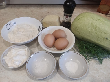 Подготовьте продукты. Кабачки подойдут любые, и молодые, и зрелые. Молодые можно использовать не очищая, а у зрелых надо будет срезать кожицу и вырезать семена. Вес указан уже очищенных кабачков. Сметану возьмите любой жирности, яйца категории С1. Муку просейте, всыпьте в нее соду, хорошо перемешайте. Об использовании соды читайте в отдельной статье в конце рецепта.