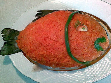 Сверху посыпьте натертым на мелкой терке яйцом. Выложите чешую из кружочков моркови, из яйца сделайте глазик