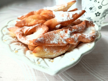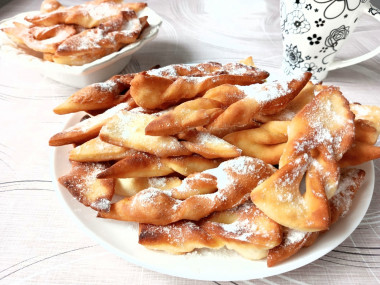 Выложите хворост на блюдо, посыпьте сахарной пудрой и подавайте к столу. Приятного аппетита!