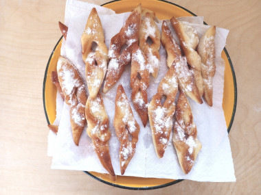 Обжарьте хворост с обеих сторон до золотистого цвета. Шумовкой достаньте готовые изделия и выложите на блюдо, застеленное бумажным полотенцем, чтобы в него впитался избыток масла.