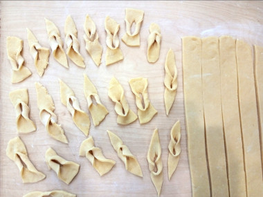 Надрежьте ромбики посередине. Проденьте один хвостик через надрез как показано на фото. Полученные жгутики отряхните от излишков муки.