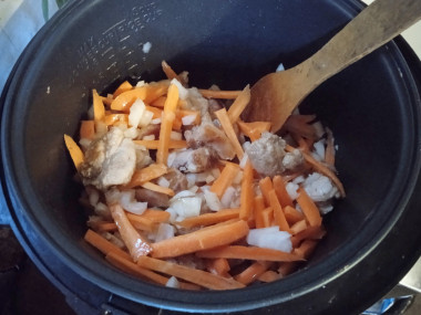 Понравился мне рецепт плова в мультиварке. Очень люблю готовить в мультиварке, это просто и быстро. Не нужно стоять возле плиты. Решила сделать такое блюдо на ужин для всей семьи. Взяла за основу плов из баранины в мультиварке, заменив на более привычное для нас мясо. У баранины своеобразный вкус и не все её любят. Использовала мякоть свинины для плова. Обжарила овощи по описанию в рецепте, шкварки я выкинула. Затем положила мясо и готовила до румяности. Засыпала круглый рис, зиру, куркума, соль, перец и приправу для плова. Взяла 5 головок чеснока, очень люблю чеснок тушёный) Добавила воды и готовила в режиме "плов" 35 минут в мультиварке.